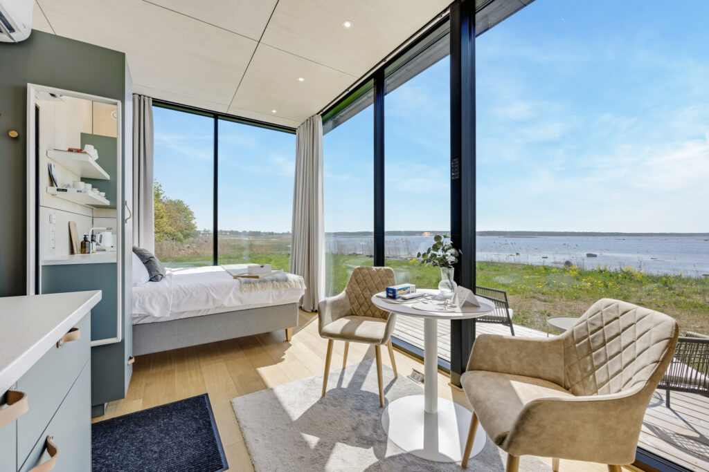 The Tiny Marienholm villas with glass walls are located on the Marienholm peninsula in the city of Haapsalu. The idyllic cafes and cultural events of the resort town are just a walk or a BOLT electric scooter ride away. The boutique hotel atmosphere with an elegant interior awaits you in the mini villa, with breathtaking views of the sea and surrounding meadows to be enjoyed from every corner of the house. Each house has a private bathroom, a kitchen suitable for cooking and a terrace facing the sea.
